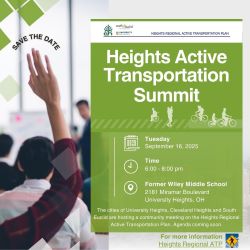 The cities of University Heights, Cleveland Heights and South Euclid are hosting a community meeting on the Heights Regional Active Transportation Plan on September 16, 6-8 p.m., at the former Wiley Middle School (2181 Miramar Blvd.) to discuss the benefits of active transportation infrastructure projects, give updates on specific projects. and discuss next steps. The […]